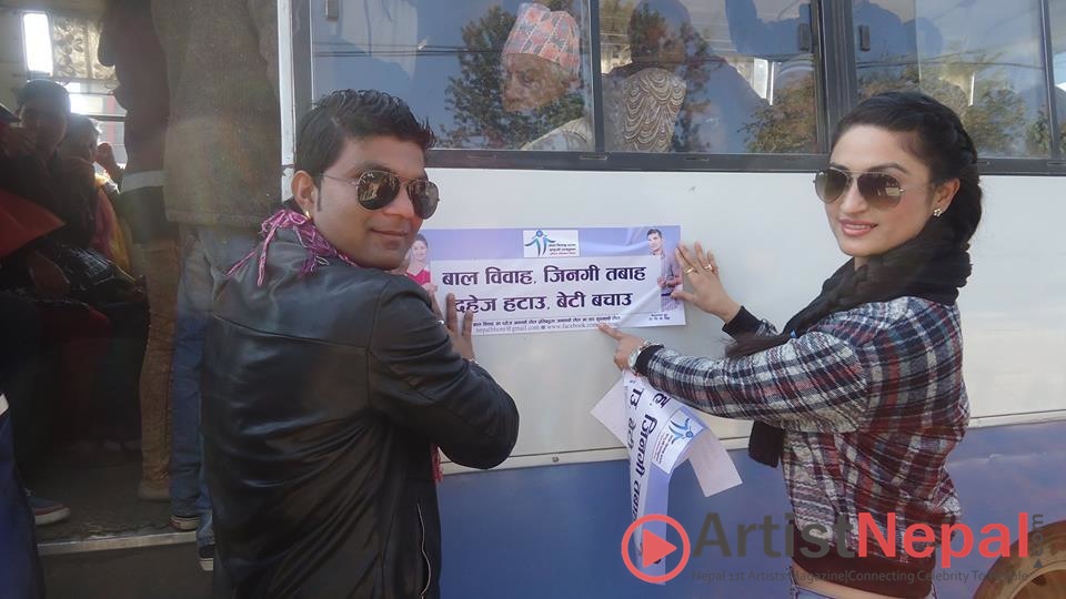 बाल विवाह एवम दाइजो प्रथा उन्मूलनमा योगदान गर्न उत्पादित सामाजिक मान्यता परिवर्तन सामाग्रीहरु मध्ये विभिन्न आकारका स्टीकरहरु काठमाडौ उपत्यकाका सार्वजनीक बस, माइक्रो, ट्याक्सी, टेम्पो गरी ५०० भन्दा बढी यातायातका साधनहरुमा टांस गर्ने कार्य सम्पन्न भएको छ । गौशाला ट्रैफिक तथा प्रहरी प्रभागको सहयोगमा र १०० युवाहरुको सहभागीतामा गौशला बस स्टप, प्रहरी कार्यालायको अगाडी काठमाडौ उपत्यकामा संचालीत सार्वजनीक यातायातका साधनहरुमा उक्त स्टिकरहरु टांस गर्दा सयौ व्यक्तिहरुको उपस्थिती रहेको थियो । उक्त अवसरमा यस बाल विवाह एवम दाइजो उन्मुलन राष्ट्रिय अभियान, नेपालका सद्भावना दुतहरु नायक डा. सिके सिहं र नायिका गरिमा पन्तको पनि सक्रिय सहभागिता रहेको थियो ।