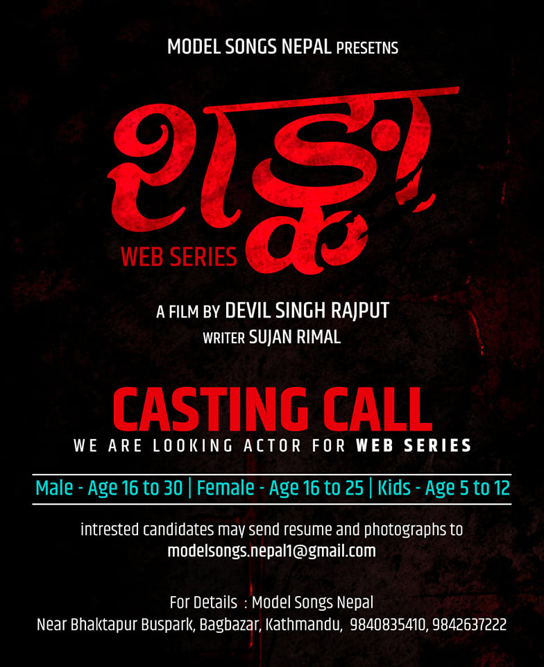 मोडल सङ्ग्स नेपालको प्रस्तुतीमा डेविल सिंह राजपुतको निर्माण तथा निर्देशन रहने वेबसिरिजमा सुजन रिमालको कथा रहेको छ। निर्माण टोलीेले अभिनय गर्न चाहने कलाकारको निम्ति आवेदन फाराम खुल्ला गरेको छ । १६ - ३० वर्ष भित्रको उमेर समुहका पुरुष मोडल, १६-२५ वर्षका महिला मोडल तथा ५-१२ वर्षका बाल कलाकारले बागबजारस्थित निर्माण संस्था मोडल सङ्ग्स नेपालको कार्यालयबाट फाराम बुझाउन सक्नेछन । साथै कार्यालयको इमेल ठेगाना modelsongs.nepal1@gmail.com मा समेत आफ्नो विवरण पठाउन सक्नेछन ।