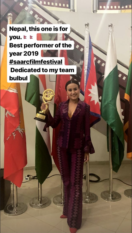 उनले अवार्ड हातमा बोक्दै उक्त अवार्ड नेपालको लागि भएको बताएकी छिन् । यसअघि नायक गरिमा पन्तले चलचित्र झोलाबाट उत्कृष्ट नायिकाको अवार्ड हात पारेकी थिइन् । सार्क फिल्म फेस्टिबलमा दिनेश राउत निर्देशित चलचित्र ‘प्रसाद’ र बुलबुल प्रतिस्पर्धामा थिए ।