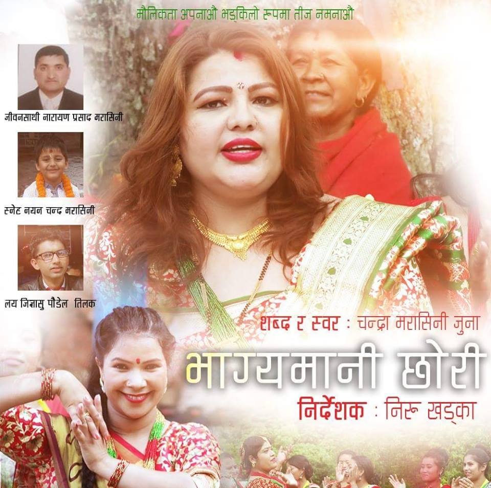 लोक गायीका चन्द्रा मरासिनी जुनाको नयाँ तिज गीत ‘भाग्यमानी छोरी’ सार्वजनिक भएको छ । आफ्नै शब्द रचनामा तथा आवाजमा जुनाले गीतमा आँफुलाई भाग्यमानी छोरी तथा बुहारीको रुपमा प्रस्तु्त गरेकी छन् । गीतलाई गायक जिज्ञासु पौडेल तिलकले लय दिएका छन् ।