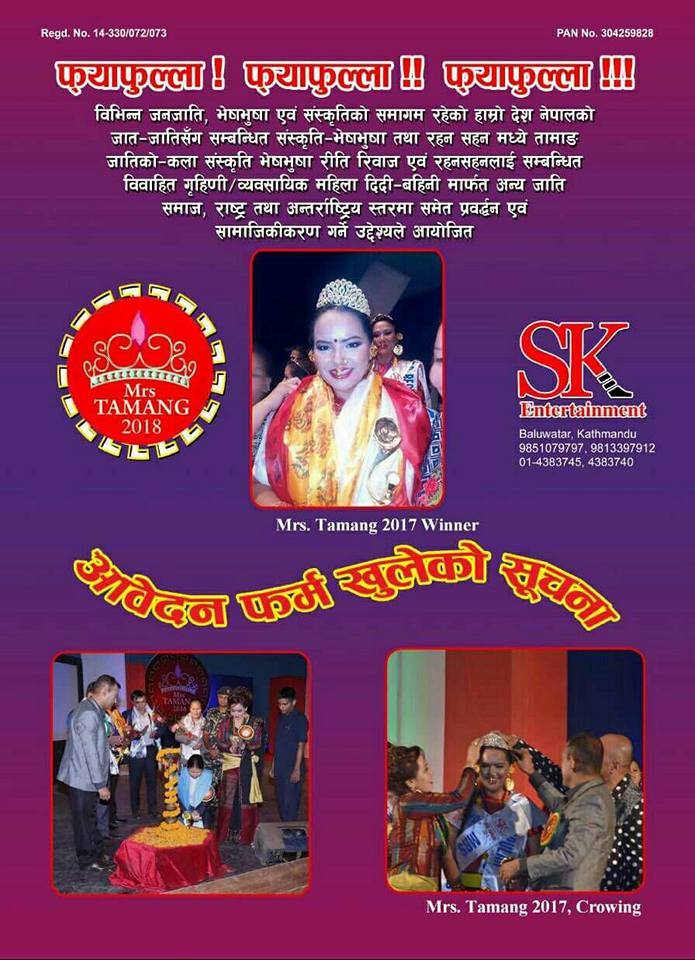 एसके ईन्टरटेनमेन्टको आयोजनामा “मिसेस तामाङ्ग नेपाल २०१८” हुने भएको छ । एसकेले तामाङ्ग समुदायका बिवाहित महिलाहरुको कला संस्कृति तथा भाषा लगायतको समग्र व्यक्तित्व विकास गर्ने प्रतियोगिता मिसेस तामाङ्गको आयोजना गर्दै आएको छ । बिगत केहि बर्ष देखि विभिन्न सौन्दर्य प्रतियोगिताहरु आयोजना गरेर ख्याति कमाउन सफल एसके ईन्टरटेनमेन्टले सौन्दर्य प्रतियोगिताहरु मध्येको लोकप्रिय र चर्चित “मिसेस तामाङ्ग नेपाल २०१८” का लागि आवेदन खुल्ला गरेको हो ।