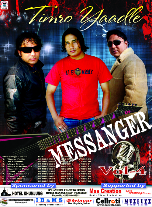 Rajesh Hamal had alreadt release his latest album Messanger Vol. 4 Debuting in 2052, Hamal has been continually striving to lend a different taste to the listeners ever since Of the 10 songs in the new album , hamal ha 5of them , viz. timro yaad le , maayaa maayaa, timi bina, chiso raat and yauaa deu. Another promising singer sameer hamal has lent his vocals to the others 5 - maayaa garchhu ma, sapanaa haru, yo swarthi, Bitijane and maayaa hunchha. the album has been released by Rhythm Readers. Prior to this, Rajesh Hamal Had come up with 3 previous albums, Messanger Vol.1,2 and 3 .