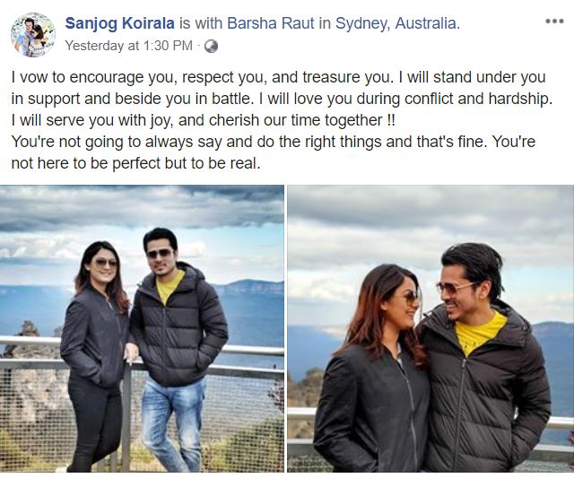 यसरी सामाजिक संजाल मार्फत अनेक ट्रोल भने पछि उनलाई साथ र हिम्मत दिन श्रीमान् संजोग कोइराला अगाडि सरेका छन् । अहिले उनी पनि वर्षासँग अष्ट्रेलियामै छन् । उनले वर्षासँगको रोमान्टिक दुई फोटो सामाजिक सञ्जाल फेसबुकमा साझेदार गर्दै लेखेका छन्,