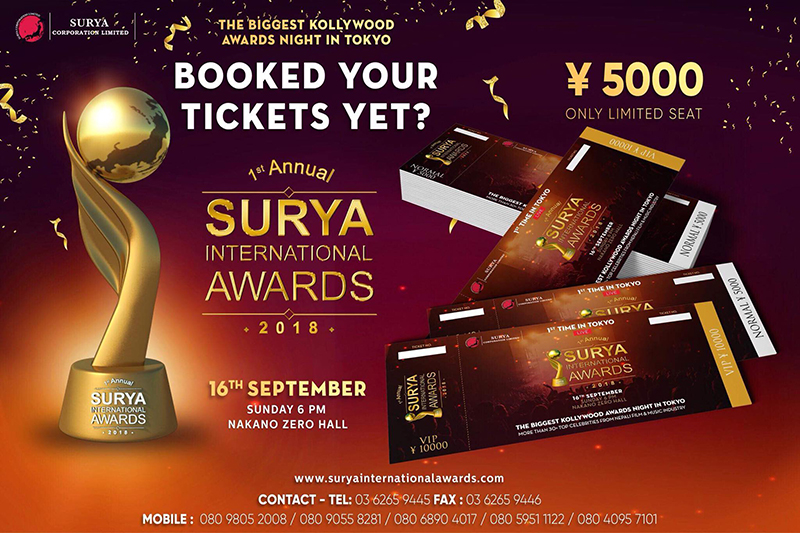 जापानको टोकियोमा अवस्थित नाकानो जेरो हलमा आगामी आईतावार आयोजना हुने 'सुर्य ईनटरनेशनल अवार्ड'को तयारी पुरा भएकोछ। फिल्मको ६ विधा र गायनका ६ विधा गरि १२ विधामा अवार्ड वितरण गरिने उक्त कार्यक्रमको लागि नेपालबाट शुक्रवार ४ दर्जन बढि कलाकारहरु जापान लाग्दैछन्। यसै समारोहमा कलाकार तर्फ बसुन्धरा भुषाल, भुवन केसी र पत्रकारतर्फ सामिप्यराज तिमील्सिना र श्रिधर पौडेल पनि बिशेष सम्मानित हुनेछन।